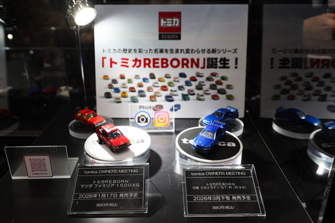 ふたつ目の発表は、「トミカ」の新ラインとなる「トミカREBORN」だ。こちらは、これまでの55年間の歴史の中から人気の車種をピックアップして商品化するという企画である。第1弾として1月17日に発売されるのは「トミカREBORN マツダ ファミリア 1500XG」。第2弾は「トミカREBORN 日産 スカイライン GT-R(R34)」で2026年3月下旬に発売予定だ。価格はそれぞれ880円を予定している。