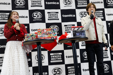 今回のイベントはクリスマスも近いということで、ゲストのふたりにクリスマスプレゼントが用意されていた。DAIGOさんがもらった大きなサンタの靴下の中には55周年デザインの「トミカ」とセットで飾ることができる「トミカガレージ」が、佐藤さんにはクリスマスのギフトセットということで「トミカアドベントカレンダー」がそれぞれプレゼントされていた。