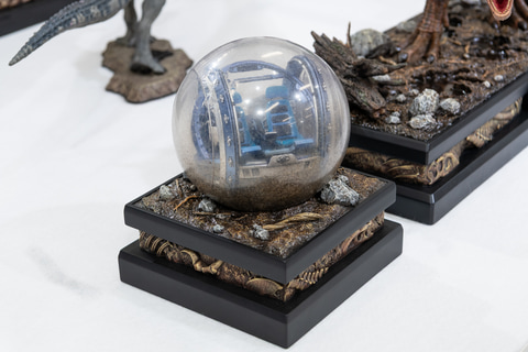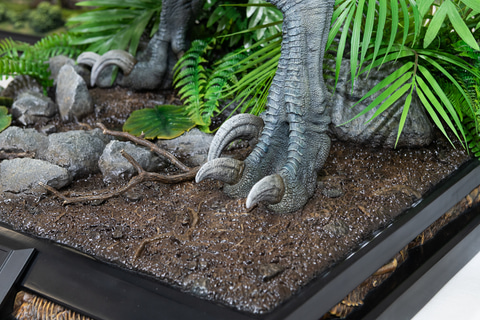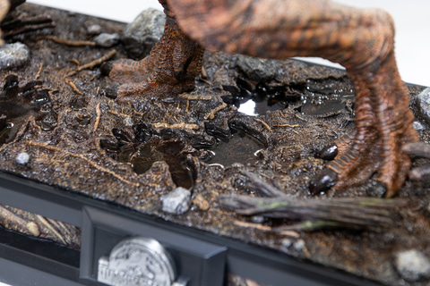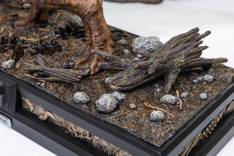 湿気った地面を多数の恐竜が踏みしめて水分が染み出した印象を受ける台座は、劇中で「ジャイロスフィア」を襲った舞台を再現している。枯れ木が堆積した腐葉土の質感もきれいに描き出されていて、隅々までこだわられたスタチューだと感じる。「ジャイロスフィア」のスタチューも付属する。