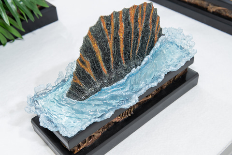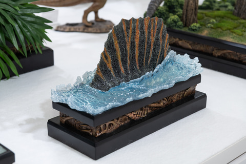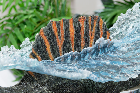 巨大な体を1/15スケールで造形し、細かく刻まれた傷や舌と咬筋を覆う粘膜のテカリまで生物らしい美しさを感じる仕上がり。前足のかぎ爪は非常に鋭く造形されており、攻撃力の高さを感じる。背びれだけを飾って楽しむことも可能だ。