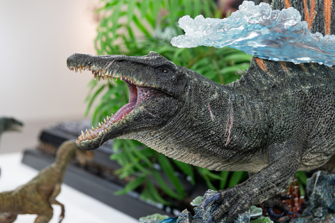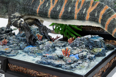 「レガシーミュージアムコレクション ジュラシック・ワールド/復活の大地 スピノサウルス」は1/15スケールで造形。クリアパーツで水面を造形し、その下のサンゴや魚が住む岩場まで細やかに造形している。