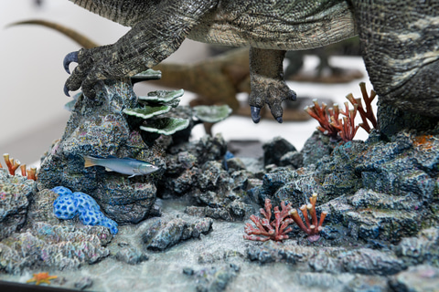 うろこ状の表皮や鋭い目、生えそろった牙それぞれのツヤ感が細かくコントロールされていて、台座の土や色鮮やかな草までこだわりを感じる造形だ。