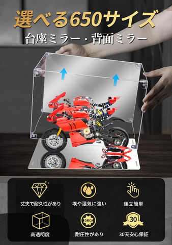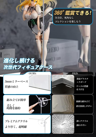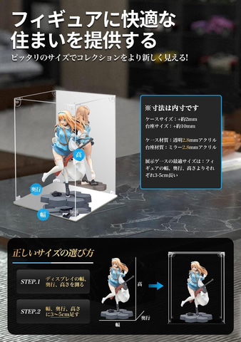 本商品は、透明アクリル素材を採用したフィギュアケース。台座と背面がミラー仕様になっているため、あらゆる方向からコレクションを鑑賞できる。また、独自の高強度接続構造で圧倒的な堅牢性を実現。様々なサイズがあり、今回はそのうちの一部がセールの対象となっている。手袋とクリーニングクロスが付属する。