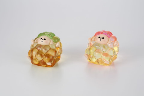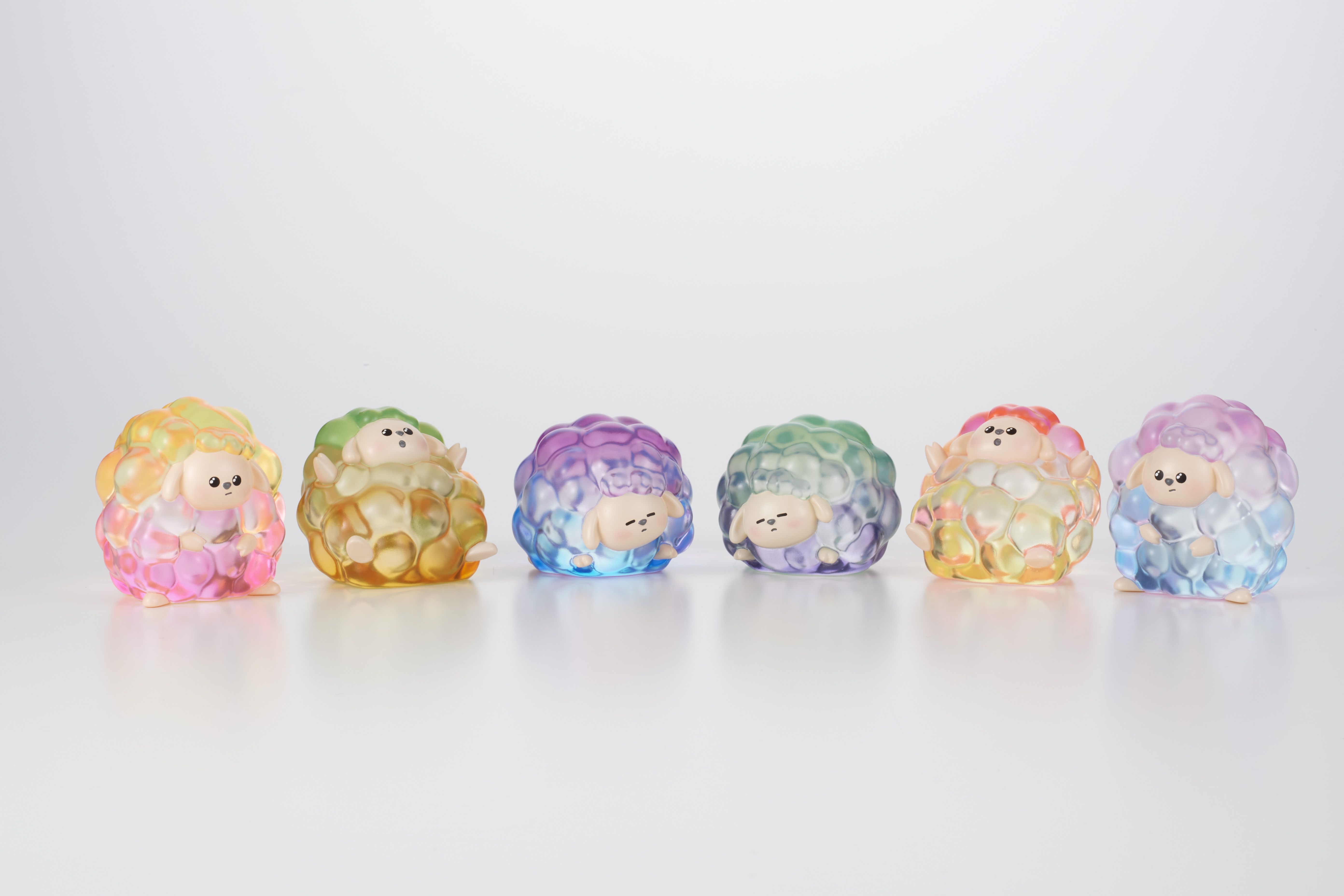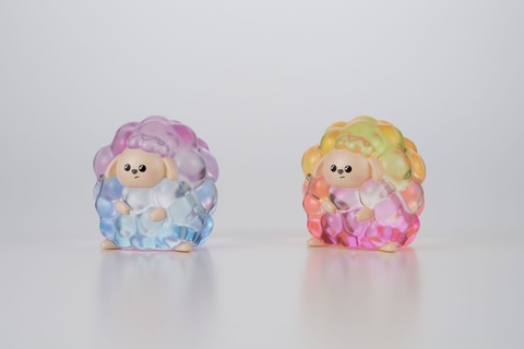 本商品は、透明でカラフルなヒツジのソフビ。ヒツジのふわふわ感をイメージした柔らかさが特長で、幻想的なグラデーションのカラーリングとなっている。ラインナップは、スカイブルー×ピンクの「すわりA」、ピンク×イエローの「すわりB」、イエロー×レッドの「ばんざいA」、オレンジ×イエローグリーンの「ばんざいB」、パープル×グリーンの「おねむりA」、ブルー×パープルの「おねむりB」の全6種。本体サイズは約55mm。