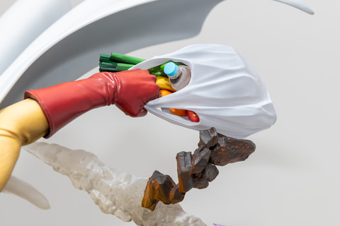 2人が岩を突き破るような、迫力のあるスタチューに仕上げられており、サイタマの左手にはスーパーの買い物袋も表現されているほか、突き破った岩の間から稲妻のような衝撃波のエフェクトも表現されている。