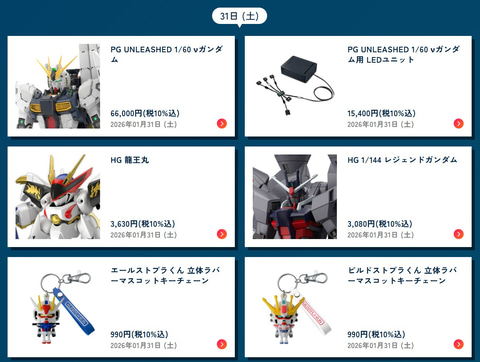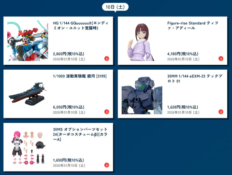 本スケジュールによると、最高峰ブランド「PERFECT GRADE UNLEASHED」よりガンプラ「PG UNLEASHED 1/60 νガンダム」は2026年1月31日、「機動戦士Gundam GQuuuuuuX」のガンプラ「HG 1/144 GQuuuuuuX(エンディミオン・ユニット覚醒時)」は2026年1月10日、「機動戦士ガンダムSEED DESTINY」のガンプラ「HG 1/144 レジェンドガンダム」は2026年1月31日、「機動新世紀ガンダムX」の美少女プラモ「Figure-rise Standard ティファ・アディール」は2026年1月10日に発売を予定している。