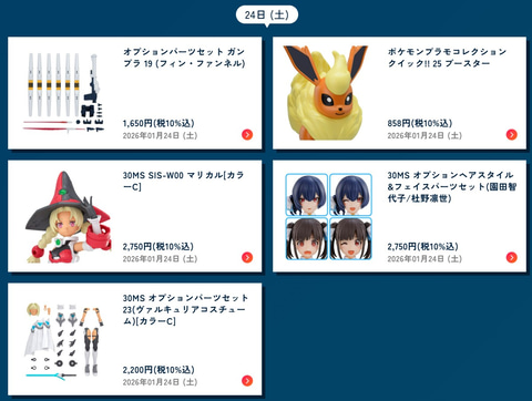 また美少女プラモ「30MS」より「30MS SIS-W00 マリカル[カラーC]」や「30MS オプションパーツセット23(ヴァルキュリアコスチューム)[カラーC]」は2026年1月24日、「30MS オプションパーツセット24(ターボコスチュームβ)[カラーA]」は2026年1月10日、「ヤマトよ永遠に REBEL3199」のプラモデル「1/1000 波動実験艦 銀河 [3199]」は2026年1月10日の発売予定となっている。