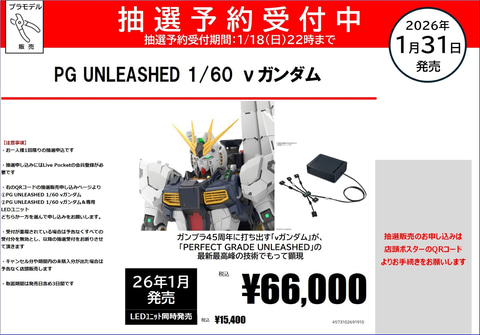 TSUTAYA田宮店とTSUTAYA デイズタウンつくばプラモLABOは、ガンプラ「PG UNLEASHED 1/60 νガンダム」の抽選販売を実施している。申込期間は1月18日まで。