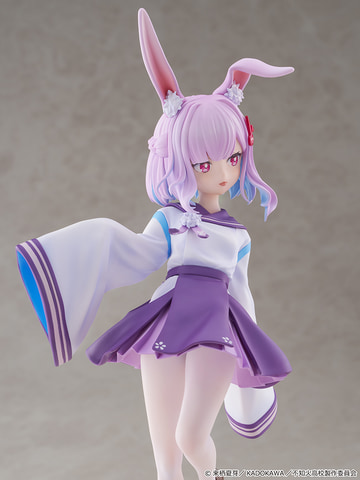 ぴょんと軽やかに跳ねた瞬間を切り取ったオリジナルのポージングで立体化され、ふわふわとした長い耳やしっぽ、ツートーンカラーの髪が揺れる姿が再現されている。特徴的な大きな袖の制服や真っ白なタイツの質感、いたずらっぽく舌を出した表情と挑発的な瞳も細かく造形されている。