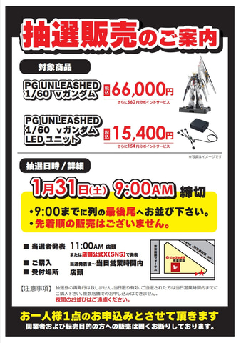 今回ビックカメラ有楽町店の公式Xアカウントにて「PG UNLEASHED 1/60 νガンダム」の抽選販売について告知しており、ガンプラ本体のほか専用LEDユニット「PG UNLEASHED 1/60 νガンダム用 LEDユニット」も抽選販売の対象となっている。