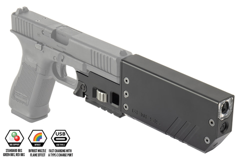 本商品は、GLOCKトイガンの日本正規ライセンスを取得したBATONによるGLOCK監修のもとで再現されたリアルな外観とリアル刻印が魅力のCO2ガスブローバックガン。特徴的なスライドカットやグリップパターン等の外見だけでなく、独自の内部構造によって樹脂スライドながら MOS(モジュラー・オプティック・システム)も実装されている。加えて、MOSプレートは4種類付属しており、各社の実物ダットサイトを搭載できる。