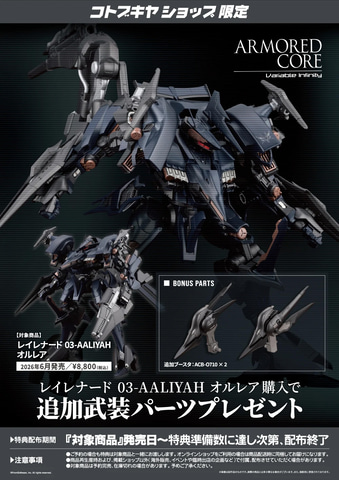 また、コトブキヤショップおよびコトブキヤオンラインショップにて予約・購入すると「追加武装パーツ」が付いてくる。