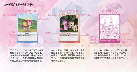 本商品は、1983年よりハズブロが展開している玩具シリーズ「マイリトルポニー」をモチーフにしたTCG。2月14日には、スターターデッキ第1弾となる「マイリトルポニートレーディングカードゲーム-友情の始まり」第1弾6種とブースターパック第1弾「マイリトルポニートレーディングカードゲーム-不思議な旅」が販売される。