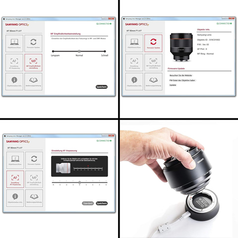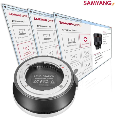 本商品は、ニコンFマウントAFレンズの各種調整やファームアップを行なうためのレンズアクセサリー。AFレンズのファームウェアのアップデートやAFピント調整、絞り調整、MF感度調整などの設定が可能。「Lens Manager」のダウンロードはSAMYANG公式サイトにて行なえる。