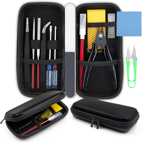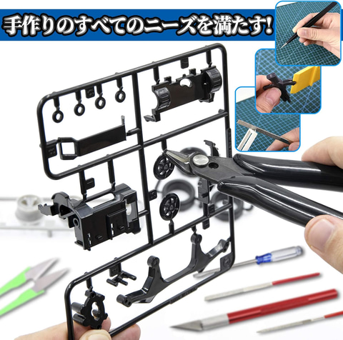 精密ストレートタイプ ピンセット×1、曲線型ピンセット精密×1、プラモデルニッパー×1、ダイヤモンドヤスリ×2、モデラーズナイフ×1、替え刃5枚付き×1、サンドスティック×1、ドライバー×2、雑巾×1、収納ケース×1、はさみ×1、スクレーパー×1