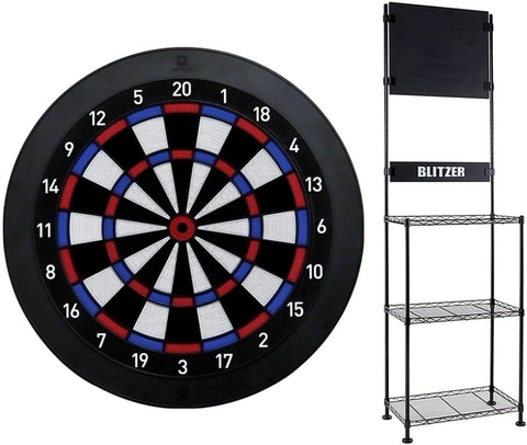 「BLITZER ダーツスタンド BSD21-BK」は、スチールラック方式の組み立て簡単ダーツスタンド。12本のダーツを収納できるダーツホルダー部があり、最上段には落下ダーツの音の緩和や小物置きに便利なシートも付属する。自立式、安定性のある大型アジャスター(足)を採用しているため、場所を選ばず設置できる。