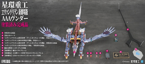 塗装完成品版では、金属製の艦船ネームプレートに加え、塗装済みの「エヴァンゲリオン 正規実用型(ヴィレ仕様)8号機β」および「正規実用型改2号機γ」を同梱しており、さらに、レーザー刻印で「AAAヴンダー」の艦影を描いたクリアブロックも付属し、特典ディスプレイとしてコレクション性を高めている。