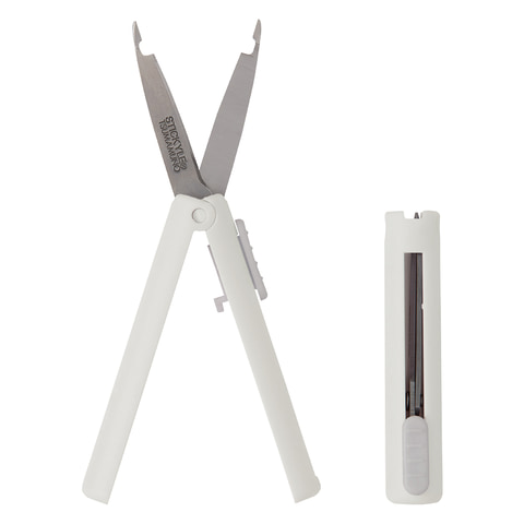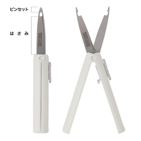 刃先がピンセット形状になっており、「ピンセット」と「はさみ」が一つになっているため、持ち替えることなくスムーズな作業が可能。本体はスライド式でキャップレス仕様。片手でも簡単に出し入れができ、コンパクトなサイズ感で、ペンケースやポーチにもすっきり収納できる。