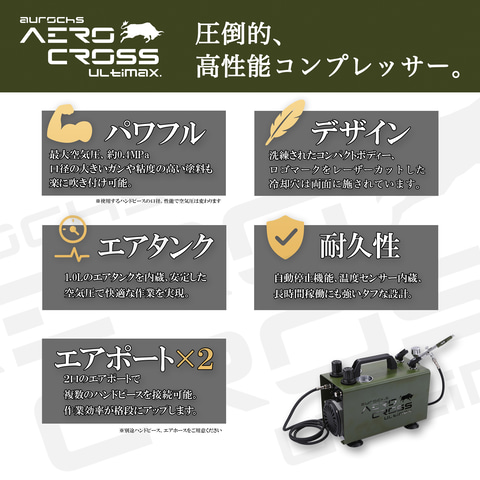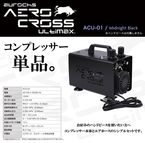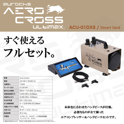 オーロックスは、コンプレッサー「aurochs AERO CROSS ULTIMAX」を2月2日に発売した。価格は「aurochs AERO CROSS ULTIMAX」とハンドピース「AC-180」のセット「ACU-01DX」が29,800円、「aurochs AERO CROSS ULTIMAX」単品が25,800円。