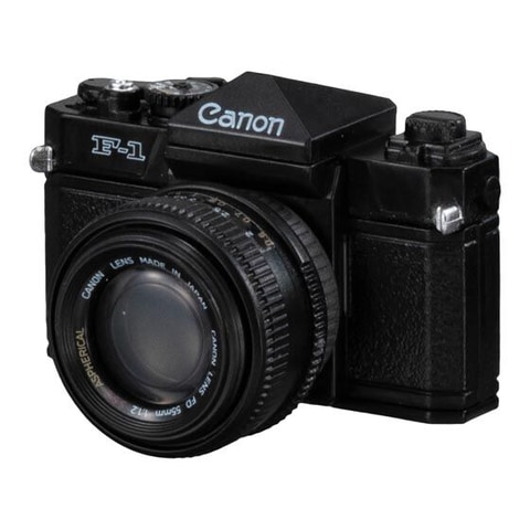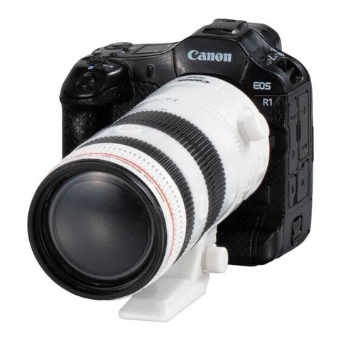本商品はCanonのカメラをミニチュア化したもの。種類は全5種で、「IV Sb(4Sb)型+Serenar 50mm F1.8 I」、「7S型+CANON 50mm F0.95」、「F-1+FD55mm F1.2 S.S.C. ASPHERICAL」、「EOS 5D Mark II+EF24-70mm F2.8L USM」、「EOS R1+RF70-200mm F2.8 L IS USM Z(ホワイト)」がラインナップ。