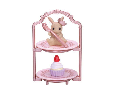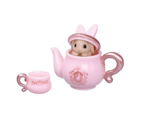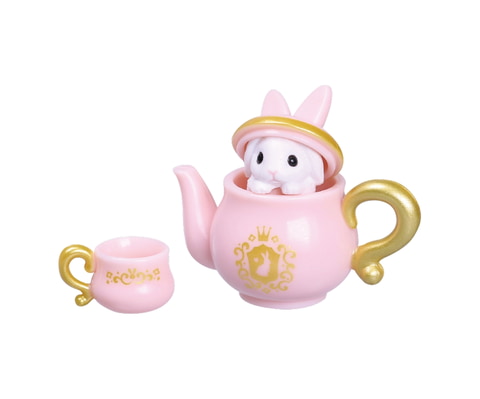 本商品は、うさぎがアフタヌーンティーを楽しんでいる様を思わせる食器類と、カップケーキをセットにしたミニチュアのカプセルトイ。