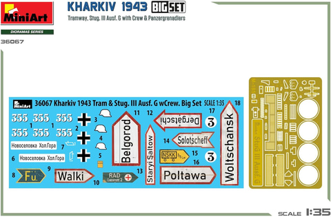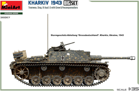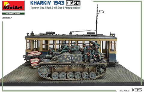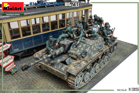 本商品は、ハリコフ攻防戦の1シーンを再現する1/35スケールの情景セット。ハリコフ攻防戦で奮戦したドイツ軍のIII号突撃砲と装甲擲弾兵、突撃砲の乗員フィギュア、街中に放置された路面電車のほか、石畳の情景ベースや道路標識等がセットになっており、1943年の戦闘時のハリコフの街並みを再現可能となっている。