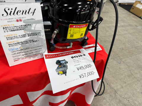 「サイレント4」は7.4リットルの大容量エアタンクを備えるオイル使用コンプレッサー。オイルでモーターの振動を軽減するため動作音量は約39dBとしており、再起動圧力の0.4MPaまで2分以上動作なしで吹き付けが可能としている。最高圧力は0.8MPaで、空気吐出量は毎分約45~52リットル。通常価格は79,200円。