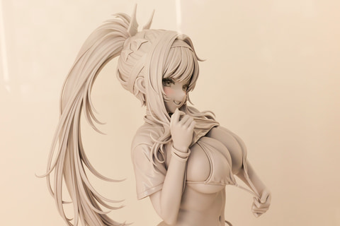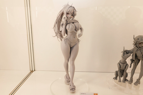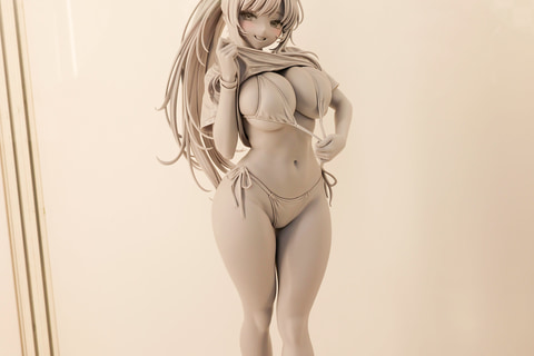 同じくAMAKUNIから発売予定のフィギュア「勝利の女神:NIKKE ラピ:レッドフード レッドフレーバー」の原型が、あみあみのブースで初公開された。こちらは公式でも描かれていたビキニの上から着たシャツをまくり上げた瞬間を再現したアイテムとなっている。