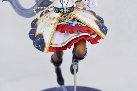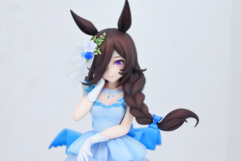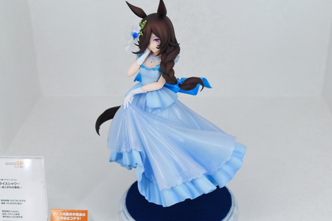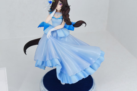 「ウマ娘」のエリアでもっとも目立っていたのは「ライスシャワー~あこがれの景色~」。青のウェディングドレスを身にまとったゲーム内イラストを忠実に立体化。ドレスは二層構造になっており、淡いブルーの生地と透明感のあるレース地の柔らかい質感を見事に表現している。