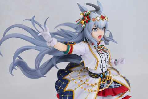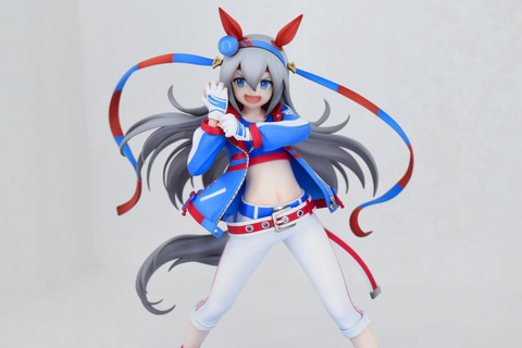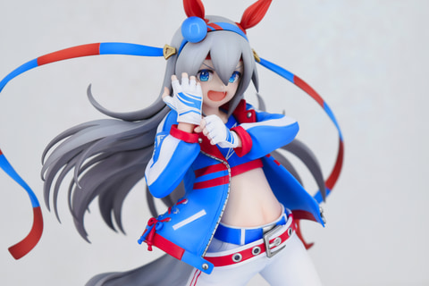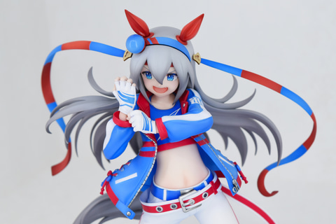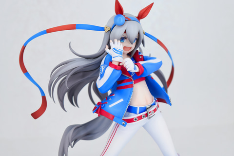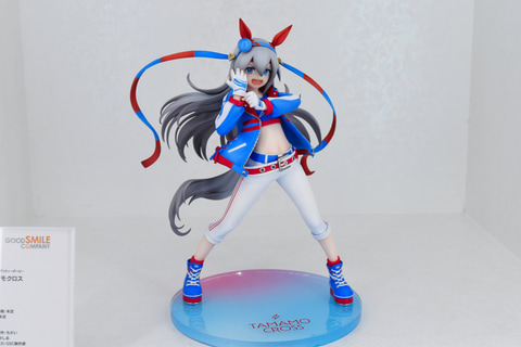 ライスシャワーの隣に展示されていたのは、勝負服姿の「タマモクロス」。レース前のワンシーンを切り取ったようなグローブをはめるポージング。なびく髪の毛とハチマキも相まって、タマモクロスらしい力強さが漲っているフィギュアとなっている。