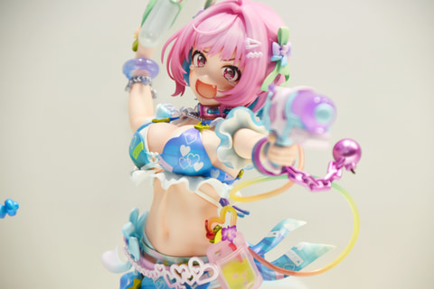 まず紹介するのは、ショーケースの周りでシャッター音が鳴りやまなかった「To LOVEる-とらぶる- ダークネス 水着シリーズ ララ・サタリン・デビルーク 1/4サイズ」。全高約36cmとかなりのビッグサイズのフィギュアとなっており、本体が大きい分もちろんいろいろな所が大ボリュームで非常に見応えがある。サイズが大きい分、塗装や造形の細かさも目立っており、肩から腰にかけてのラインの肉感表現が素晴らしく、視覚的に柔らかさが伝わってくるほどだ。