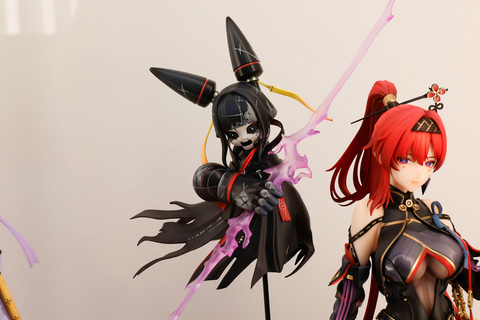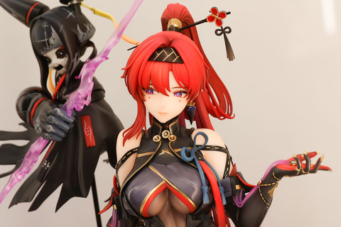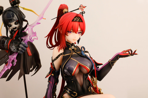 ウイスキーの樽を詰め込んだような大きな箱の上に腰掛けたポーズをしている、こちらの吟霖。繊細な作りの衣装もしっかりオリジナルのイラスト通りに作りこまれている。彼女の傍らには、攻撃時に使用する人形「ケンシ」が浮かんでいる。作品としてのボリューム感もあり、ファンならぜひとも押さえておきたくなるアイテムだ。