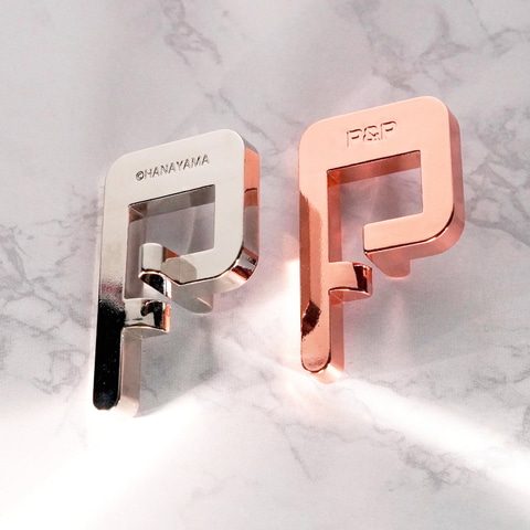2つのPのカラーは、シルバーとピンクゴールド。金属の質感と柔らかな色味が、構造の美しさを引き立てる。