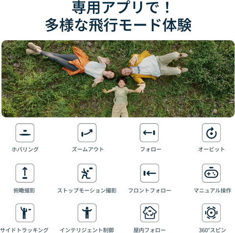4Kの高精細映像を撮影できる小型ドローン。4K/60fpsの高品質映像を104度の広視野角で撮影可能。10-bit HLG対応で、より鮮明で色彩豊かな映像を表現できる。後方近接センサーを搭載し、さらなる安全性を実現。障害物を検知した際、衝突前に最大1.5m/sの速度でブレーキがかかるようサポートする。
