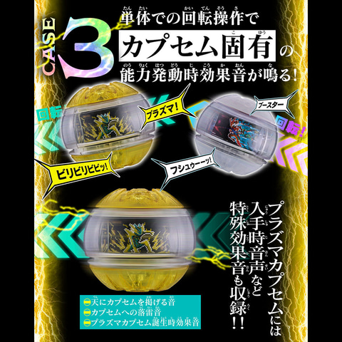 別売りの「DXゼッツドライバー」と連動ができ、ドライバーにカプセムをセットして回転させることで、ドライバーから鳴る変身音に合わせてカプセムから追加効果音が発動する。また、「プラズマカプセム」使用時には、変身時にボタン操作で「雷を帯びたフィンガースナップ音」も発動する。「ブースターカプセム」使用時には、「噴き出る排気音」など固有の音声が発動。さらに必殺技操作時も、必殺技後の追加効果音が発動する。