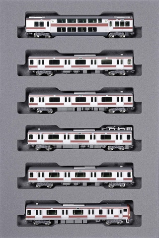 E531系の通常編成とは異なる「赤電」を、10両編成、5両編成でそれぞれ再現した模型。前面は小豆色(赤13号)とクリーム色(クリーム4号)に塗装され、側面は小豆色の帯色のラッピングが施されている。