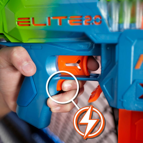 発射すると高速で交互に前後する2つのバレルを備えた電動ナーフブラスター。10本ダーツが入るクリップを2個ブラスターにセットして、ダーツを20本発射することができる。2色のナーフ エリートダーツが50本付属する。