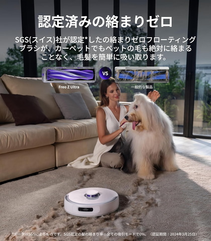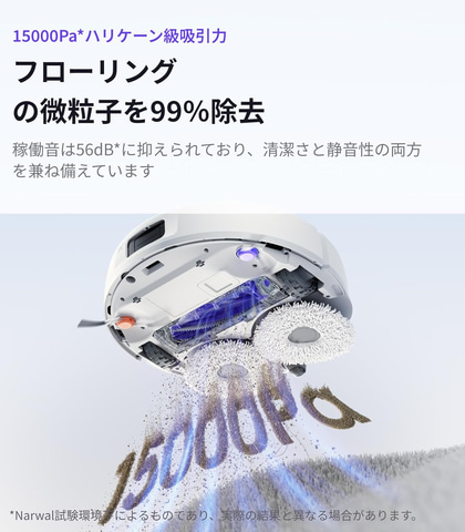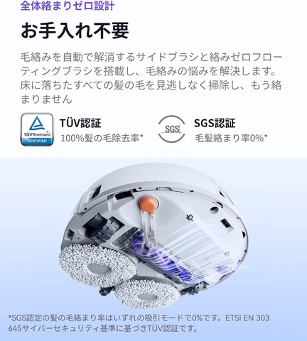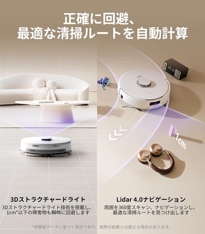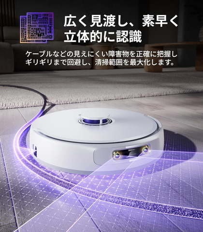 10,000Paの吸引力でホコリだけでなく、ロングヘア、ペットの毛、食べこぼし、隙間の汚れなども取り除く。独自の絡まりゼロシステムにより髪の毛が絡む前に吸引するため、長い髪を効果的に掃除できる。また、周囲を360度スキャンし、高度なナビゲーション機能により最適な清掃ルートを自動的に見つけ出す。3Dストラクチャードライト技術を搭載し、人間のように障害物を瞬時に回避することができるため、1cm以下の小さな物体も正確に識別できる。
