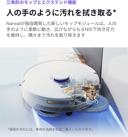 独自の三角形モップと伸びる可動式モップ(エクステンド機能)で、隅々まで汚れを拭き取る。Narwalが独自開発したモップモジュールは、柔軟に動き、広げながらも8Nの下向き圧力を維持し、人の手による水拭きのような力強さを実現する。また、部屋にある障害物の形状に合わせて、壁際の清掃方法を自動で調整し、どんな隅も柔軟に対応。家具の隙間はモップを伸ばして左右に振動、壁沿いは下圧を強めて清掃、角や障害物はモップを引き込んでスムーズに移動する。毛絡みを自動で解消するデュアルサイドブラシと絡まりゼロフローティングブラシを搭載。