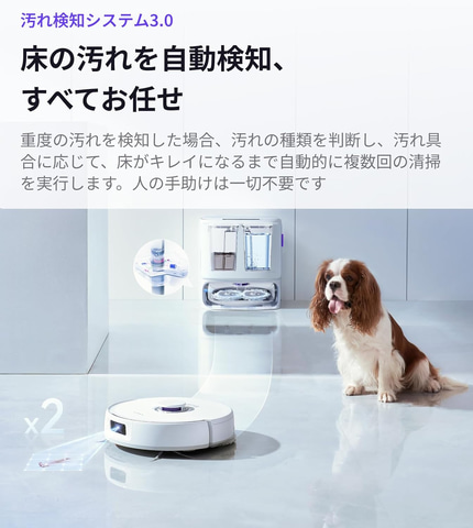 吸引力は強力な12,000Pa。汚れ検知AI「DirtSense」により、モップ洗浄時に検知した汚れの種類に応じて、洗浄温度を45~75度の間で自動調整する。ダストバッグは約120日間交換不要。清掃タスク後に45度の温風で吸い取ったゴミを乾燥させ、カビや菌の繁殖を防ぐと同時に清潔を保つ。