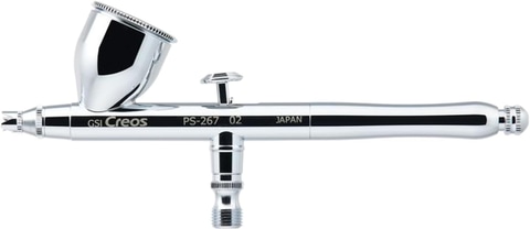 本製品は、ドロップ式ダブルアクションタイプのエアブラシ。ボタンを押すとエアーが出て、引くと塗料が噴霧される。ノズル口径0.2mmの超精密エアブラシのため、インクスポット迷彩や細かいグラデーション塗装に威力を発揮する。カップ容量は10cc。