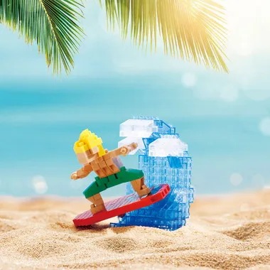 「ナノブロック サーフィン」は波に乗るサーファーの姿、ボード、白波を立てる大きな波をナノブロックで表現している。ユーザーは組み立てることで、小さいサイズながら大迫力のサーフィンの興奮を体験できるだろう。角度を変えると別な味わいを楽しめる。