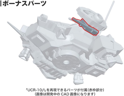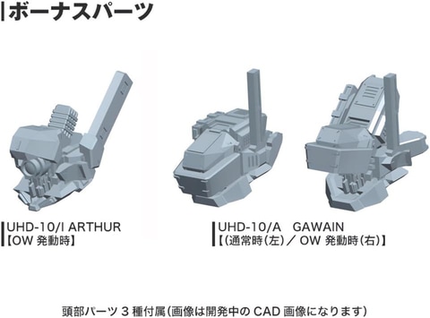 - ボーナスパーツとして、頭部パーツ3種(「UHD-10/I ARTHUR(OW発動時)」、「UHD-10/A GAWAIN(通常時・OW 発動時)」)と、「UCR-10/I」を再現できるコア用パーツが付属。発売中の「UCR-10/L AGNI(アグニ)」と組み合わせて、幅広いカスタマイズが可能。