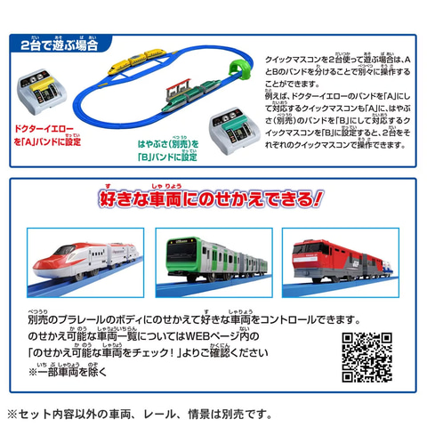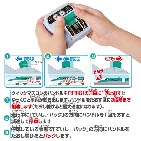 本製品はハンドルを倒す回数によって前進する速度を変化させたり、減速して停車、バックまでを行なえる「クイックマスコン」と、「クイックマスコン」で操作できる「クイックマスコンIRシャーシ」を搭載した「H5系新幹線はやぶさ」または「923形 ドクターイエローT5編成」のセット。