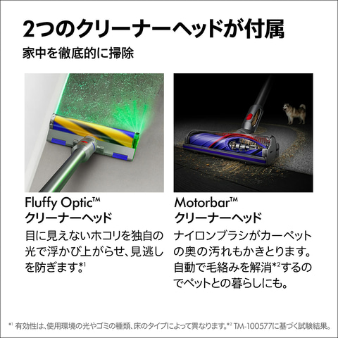 F1マシンが搭載するエンジンの約5倍の速さに相当する、毎分最大107,000回転を実現した「ダイソン デジタルモーター V8」搭載。暗くて狭い隙間や届きにくい場所の掃除に便利なLED隙間ノズルも付属する。またSlim Fluffyクリーナーヘッドは、道具を使わずに取り外せる構造で、簡単に手入れできる。