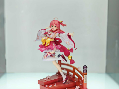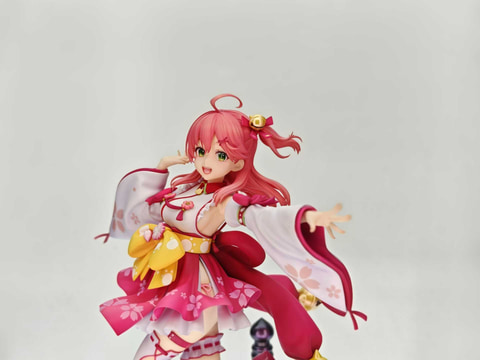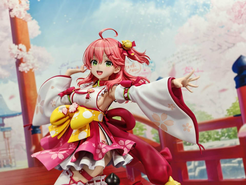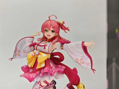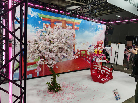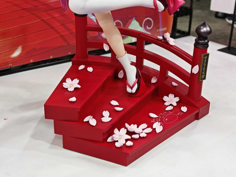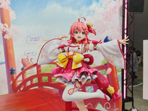 会場では「ホロライブ さくらみこ 1/7スケールフィギュア」の彩色見本も展示されている。本商品は6月発売予定、価格は28,600円。3月6日より受注開始されている。フィギュアに加え、鮮やかな赤に塗られた台座には桜の花の花びらが散っており、華やかな雰囲気だ。