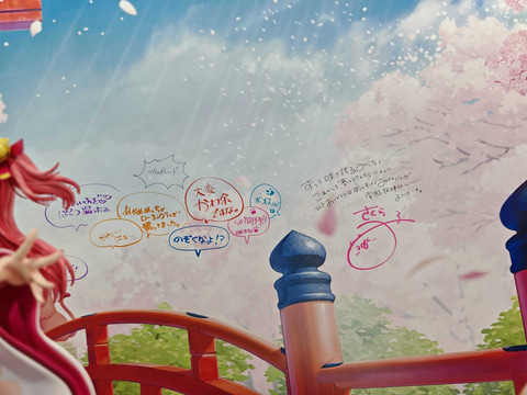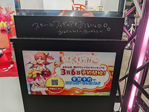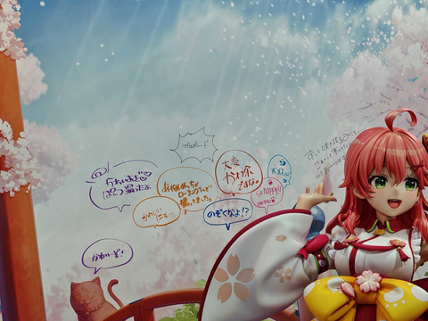 「1/1さくらみこフィギュア」は、6月発売予定の「ホロライブ さくらみこ 1/7スケールフィギュア」と同じポーズで、同フィギュアをスケールアップしたようだ。桜の木が描かれた背景に加え、桜の木のオブジェまで配置され、会場を訪れた人はフィギュアの様々な部分をチェックできる。背景にはさくらみこさんのサインに加え、他のメンバーのコメントも確認できる。