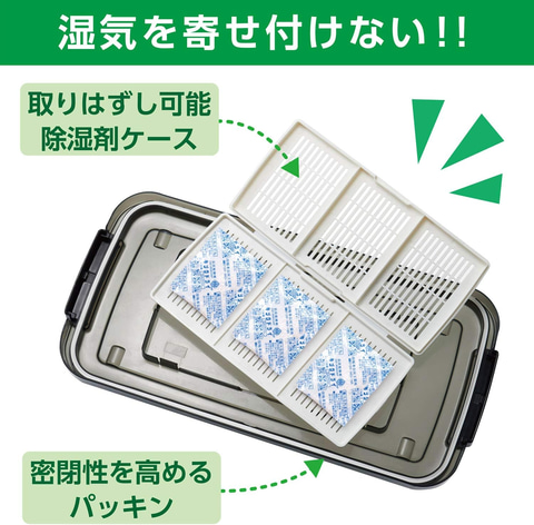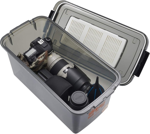 本商品は、湿気や埃から機材を守る防湿保管ケース。蓋の部分には取り外し可能な除湿剤ケースと密閉性を高めるパッキンが付いている。また、積み重ねて効率的に収納できるほか、移動に便利なローラーを装備している。
