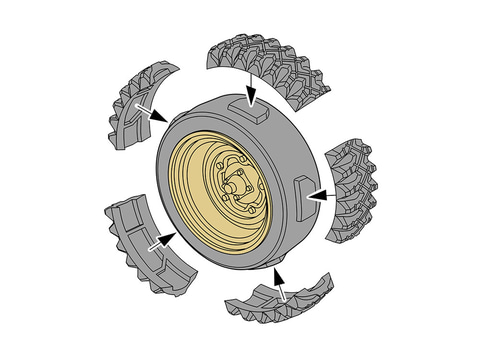 本商品は、第二次大戦中に幅広い戦線で使われた「シュビムワーゲン 166型」のワイドホイールを装着した姿を、1/35スケールプラモデルで再現したもの。幅200mmのワイドホイールをパーツ化している。
