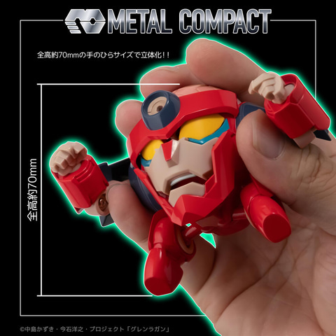 本商品はアニメ「天元突破グレンラガン」より主人公、シモンが掘り当てた小型ガンメン「ラガン」をMETAL COMPACTブランドで立体化したもの。全高約70mmの手のひらサイズながらダイキャストを多用したパーツ構成による重量感を実現。